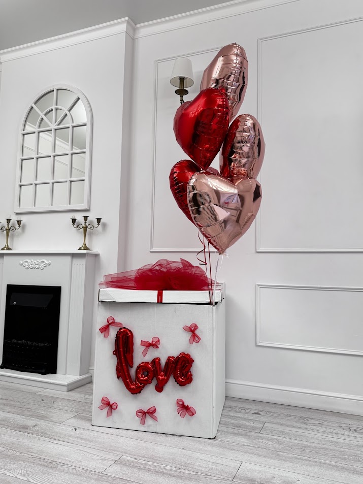 В наборе коробка, надпись, банты, шары сердце 5 шт., грузик